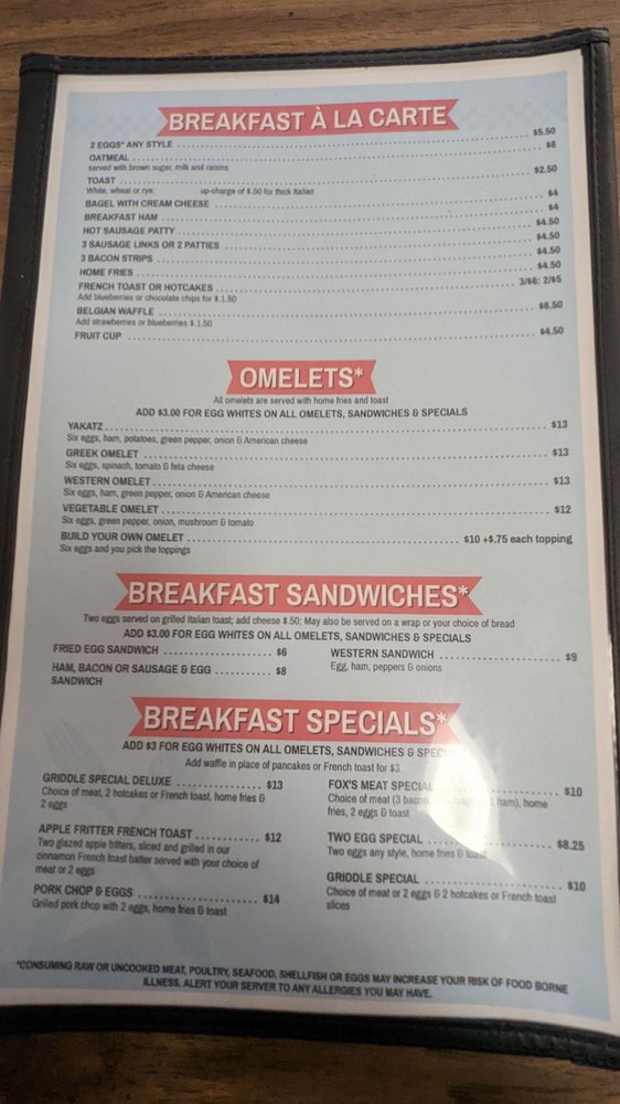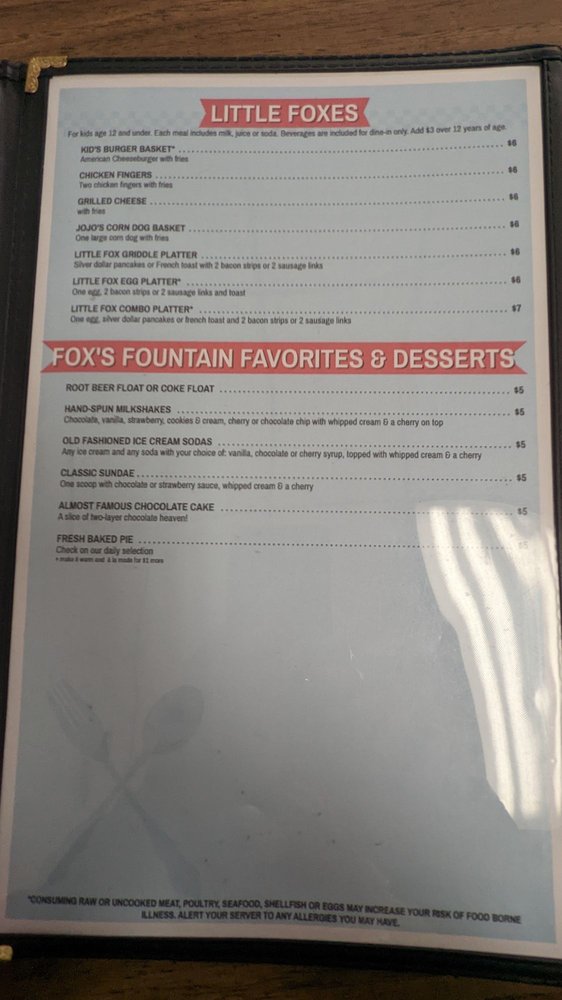 On the menu, you'll find a variety of classic options, from fluffy pancakes to crispy bacon and mouthwatering Belgian waffles. For the little ones, Little Foxes offers kid-friendly meals like chicken fingers and grilled cheese, all at $6.